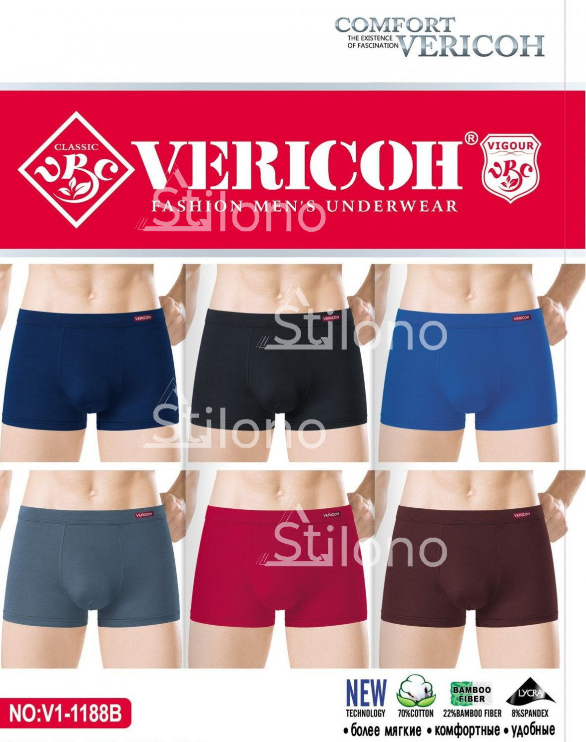 Модель трикотажных боксеров VERICOH - это классика бельевой моды. Они очень удобные, не сковывают движений, поэтому превосходно подходят для каждодневной носки. Материал – гипоаллергенный и гигроскопичный, обеспечивают приятные тактильные ощущения и здоровье коже. После многократных стирок такие изделия сохраняют цвет
